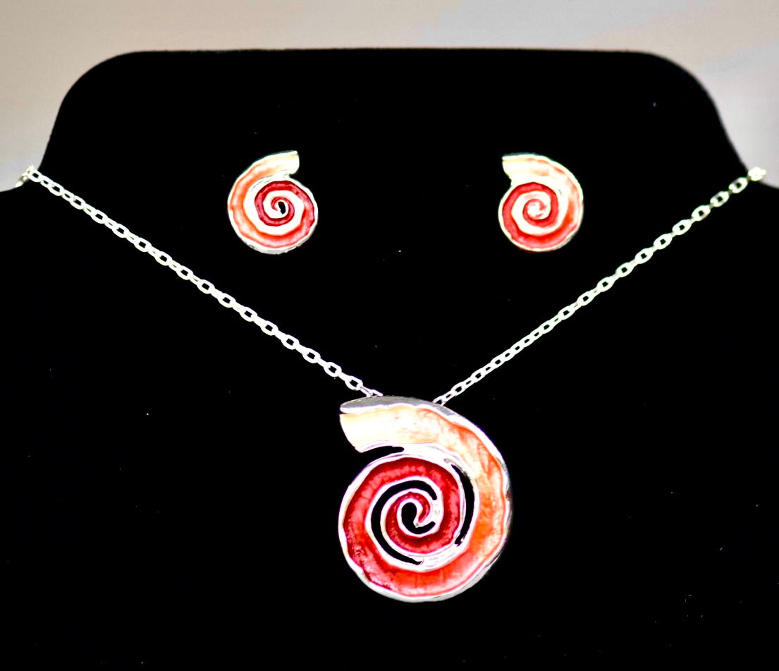 A absolutely stunning necklace and earring combo that will add that final touch to your outfit. This vivid colour design with a beautiful silver setting will make a worthy addition to your collection of designer accessories and will leave you spellbound while pairing this ammonite themed jewellery with a nice outfit to complete your look.