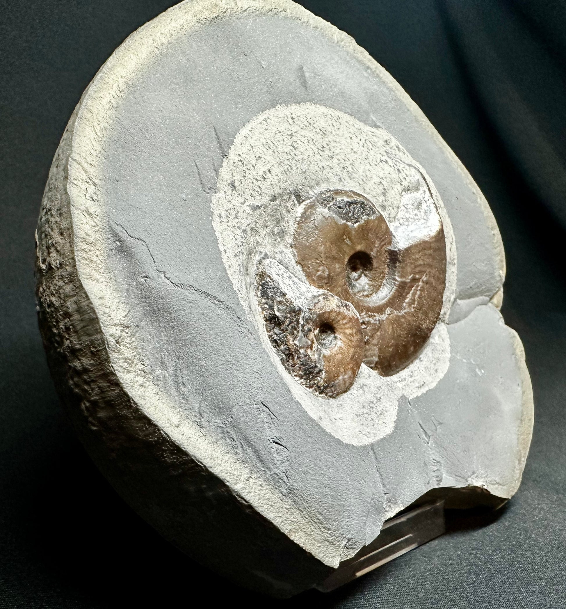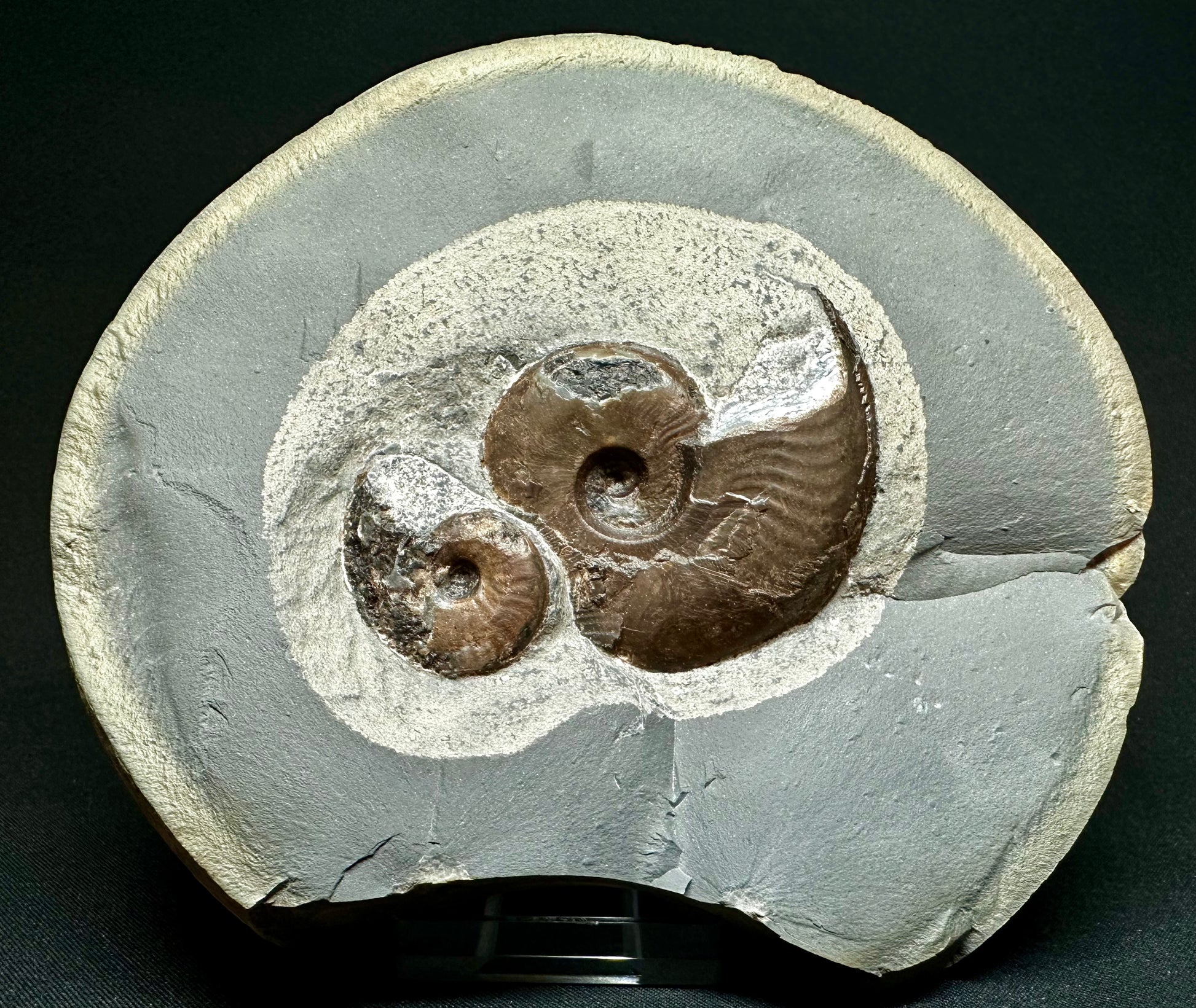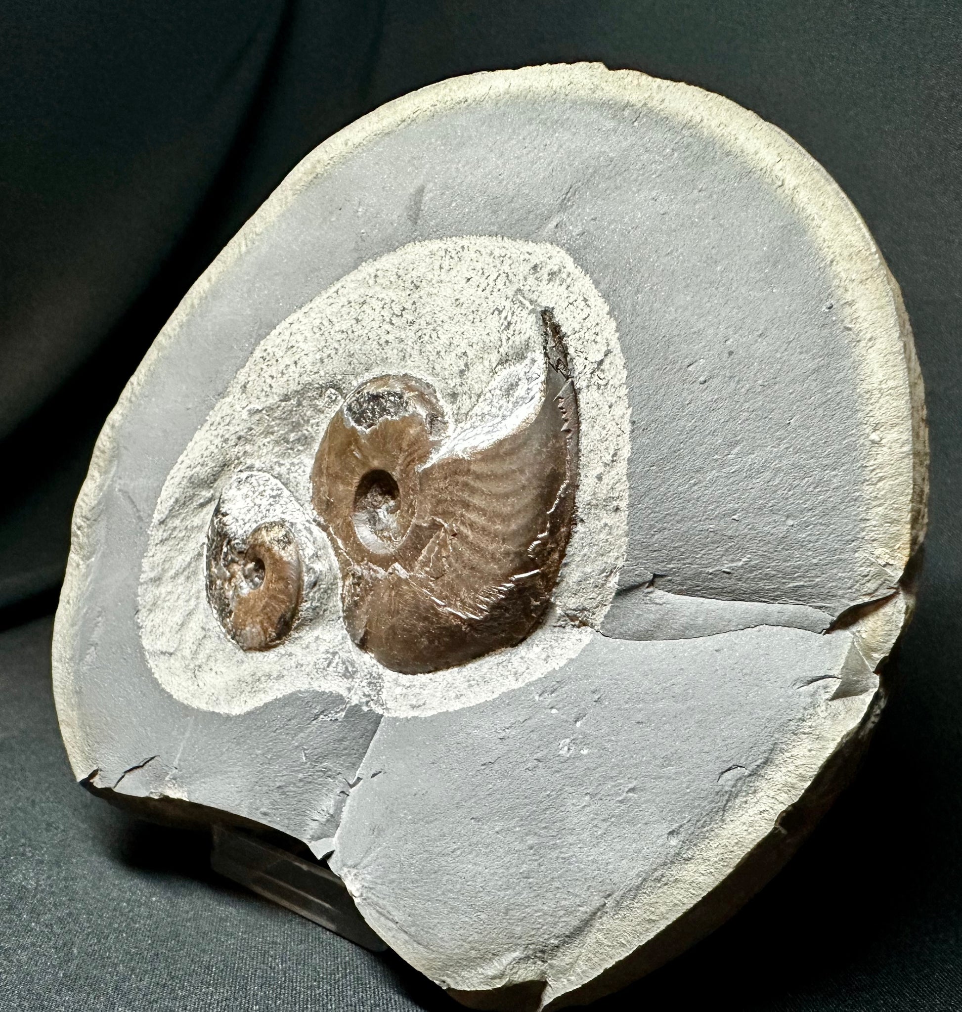 A lovely example of this Lower Jurassic British Ammonite cluster within the original matrix Found:- Falciferum Zone, Upper Lias, Lower Jurassic, Sandsend, Nr Whitby, North Yorkshire, England. Age:- 180 Million Years Old Ammonite Size = 6cm and 3cm in diameter. Overall Size = 14cm in diameter