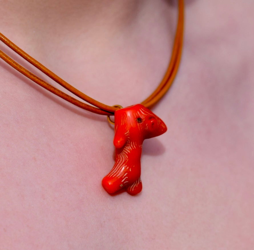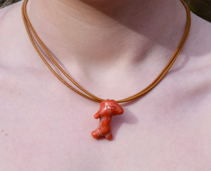 A unusual and unique fossil coral necklace that will add that final touch to your outfit. This double woven leather design will make a worthy addition to your collection of designer accessories and will leave you spellbound while pairing this deep stunning orange coloured necklace with a nice pair of earrings to complete your look.