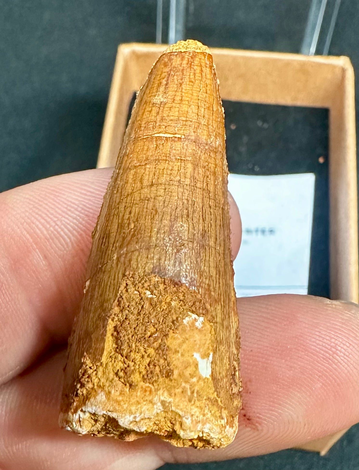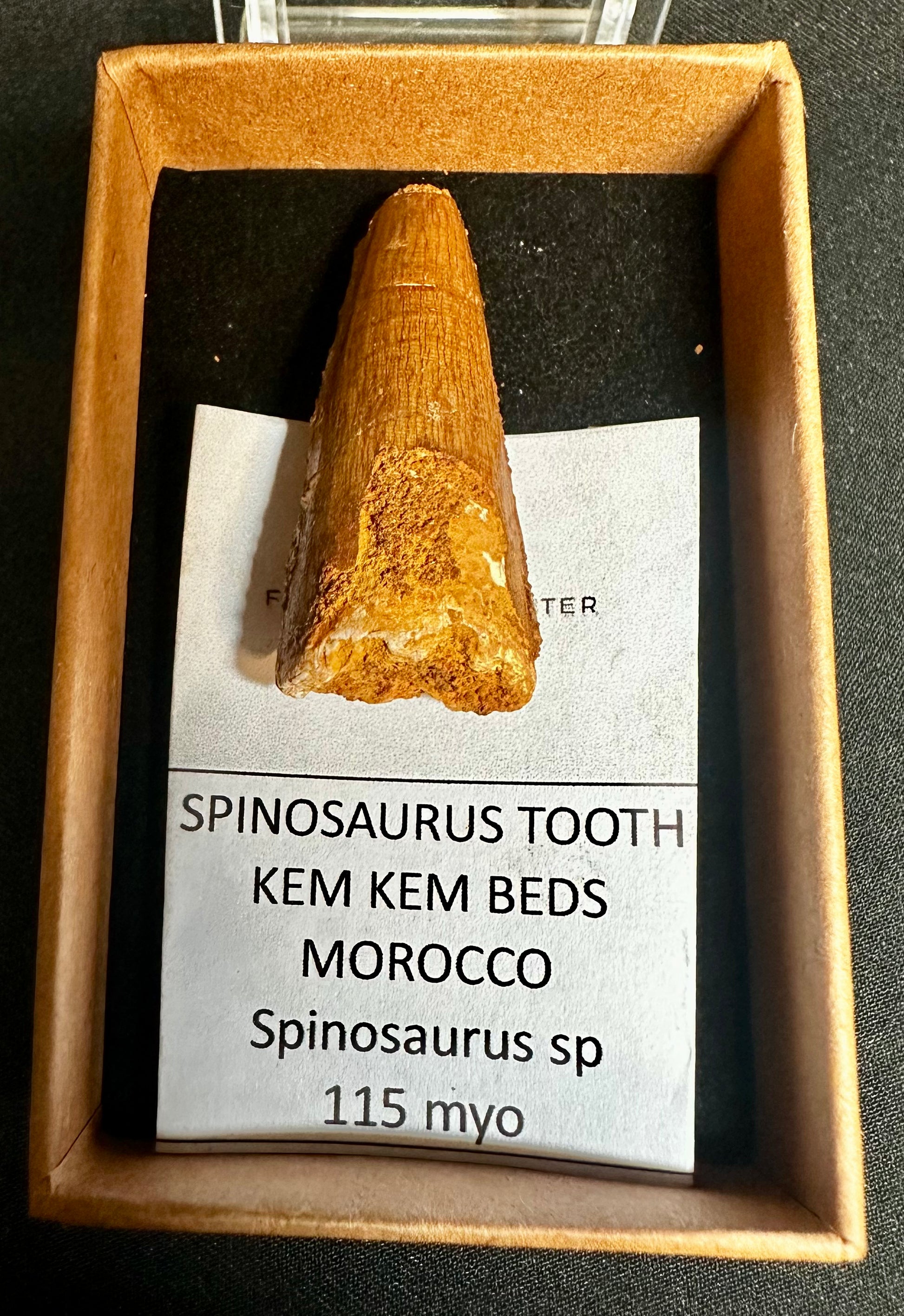 A well preserved 1.5 inch sized genuine small spinosaurus tooth. Comes in a display box with a species/locality label. Found:- Tegana Formation, Aptian, Cretaceous, Kem Kem Basin, Morocco, North Africa. Age:- 100 Million Years Old. Overall Average Size of Teeth = 2.5 cm (1 inches) high. Please note that the fossil may differ from the one advertised here. We pick the best quality tooth that is available in stock, we therefore guarantee one of equal quality.